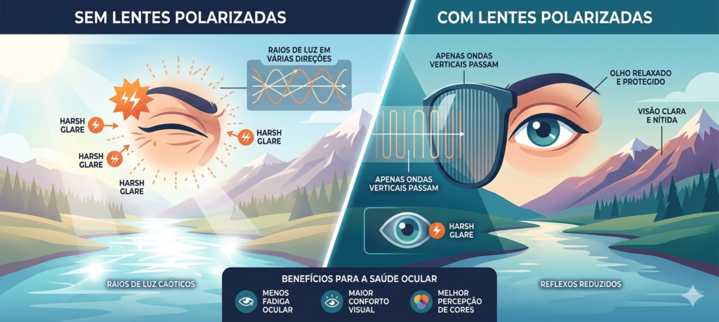 Já os óculos polarizados filtram esses reflexos, proporcionando uma visão mais nítida, com melhor contraste e muito mais conforto. Quando aliados à proteção contra raios UV, tornam-se uma escolha essencial para preservar a saúde dos olhos a longo prazo.